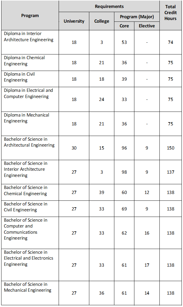 To receive a Bachelor Degree in any of the majors, the student must satisfactorily complete the required credit hours for his/her major with an overall minimum average of 65 percent, (Except for Bachelor of Science in Architectural Engineering – 70 percent) and a cumulative average of 70 percent in the major courses.